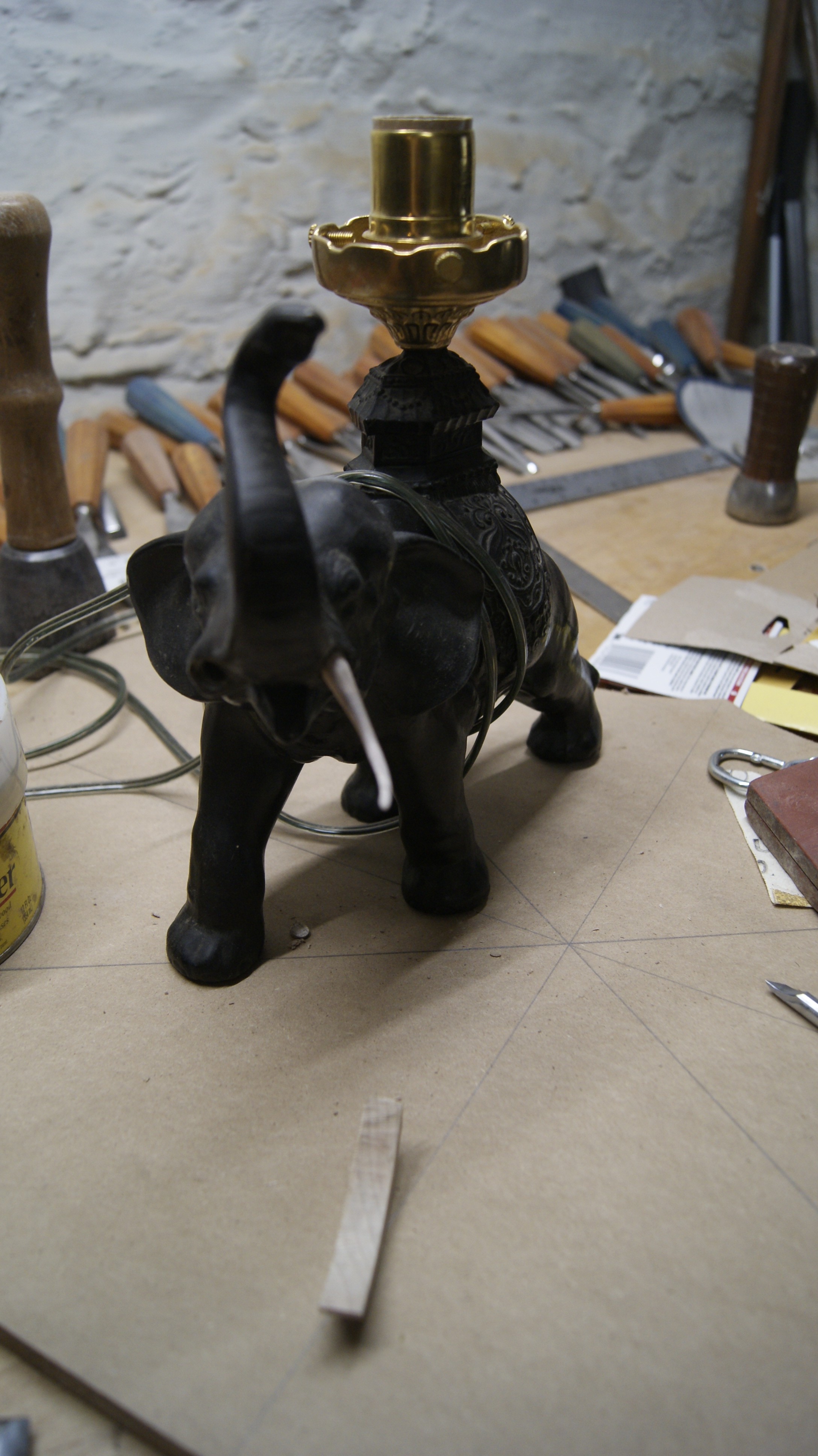 An old cast iron elephant lamp without its tusks was not quite lamp at all. And while the tusks are but a small part of the elephant whole, until Lionel designed and carved new ones to life for this lamp from elegant maple–so tusk-like is this wood–this sculptural luminosity simply didn’t shine. Again, Lionel has an eye for exquisite detail and he can carve any piece of wood to realize just the angle and curve and pose you’re seeking. You did so for this lamp, Lionel, and I’m grateful. Thank you.